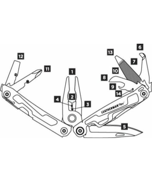 Βασικά χαρακτηριστικά: Μήκος (κλειστό): 9,7 εκ. Mήκος λεπίδας: 6,6 εκ. Υλικό: Ανοξείδωτο ατσάλι 420HC Βάρος: 168 γραμ. Πολυεργαλείο με 13 εργαλεία & αποσπώμενο κλιπ για εύκολη μεταφορά, από τη Leatherman. Εργαλεία: Μυτερή πένσα Κανονική πένσα Κόφτη καλωδίων Κόφτη σκληρών καλωδίων Μαχαίρι 420HC Λίμα ξύλου/μετάλλων Ανοιχτήρι για κονσέρβες Ανοιχτήρι πακέτων Χάρακα (3.8 εκ.) Κατσαβίδι Phillips Ανοιχτήρι για μπουκάλια Μεσαίο κατσαβίδι Μικρό κατσαβίδι Απογυμνωτή καλωδίων