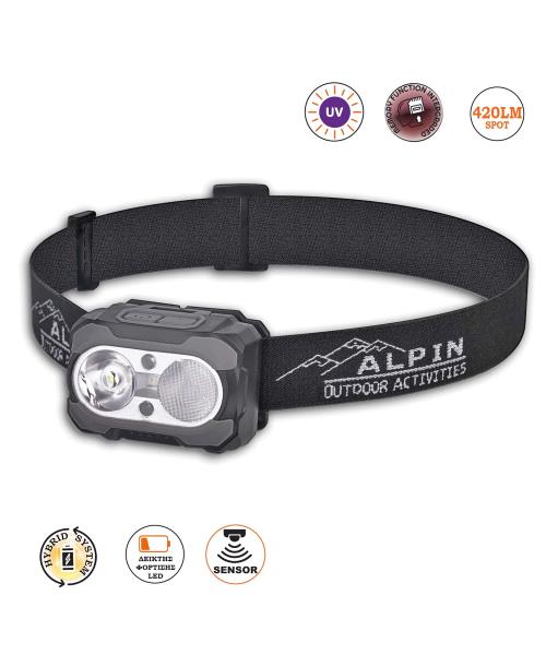 Αδιαβροχος φακός κεφαλης ΑLPIN με δυο κατοπτρα με 1 Luminus SST20 + RED COB + UV 365nm Πλήρες control λειτουργιών και ελαφρύ με μέγιστη φωτεινότητα τα 420Lm Διπλο κατοπτρο διπλη δυνατοτητα τοσο στα 420lm οσο και 365nm UV. Εξασφαλιζει εμβελεια και δυναμη και στις δυο δυνατοτητες ΑΙΣΘΗΤΗΡΑΣ ΚΙΝΗΣΗΣ ΜΕ ΕΠΙΛΟΓΗ ΜΝΗΜΗΣ: Πλήρως Παραμετροποίησιμος Σένσορας Ο σένσορας λειτουργεί σε όποια σκαλιά θέλουμε εμείς. Μνημονεύει τη λειτουργία και επιστρέφει στην ιδιά μετρά την πάροδο 3 δευτ Ελεύθερη προσαρμογή κλήσης Έλεγχος δύναμης μπαταρίας κατά την λειτουργία με Ένδειξη 4 σημείων (Μπλε LED ON Ενδεικτική 1 σκάλαΜπλε LED ON Ενδεικτική 5 σκάλα) LED δείχνει την κατάσταση φόρτισης είτε πάνω στην μπαταρία, είτε πάνω στον φακό Κύκλωμα αποτρέπει στην μπαταρία την υπερφόρτιση και υποφόρτιση της 2,5hrs Χρόνος Φόρτισης Απευθείας φόρτιση από Type C USB. Ώρες λειτουργίας Ισχυρή σκάλα 3,5 ώρες - 420Lumens Χαμηλή σκάλα 9 ώρες - 70 Lumens UV Spot 365nm: 3ώρες Red COB: 5,5ώρες 15Lumens Red Flash: 6ώρες 15Lumens Hybrid Battery system 1 X 3.7v Lithium Battery 1200mah [Περιλ.] - Φορτίσεις: 600 κύκλους [Πάει ~ 80% χωρητικότητα μετά 500 κύκλους] Input: 5V 0,5A 3*AAA Alkaline Battery [Δε Περιλ.] Μέγεθος 60*45*50mm 116gr [με μπαταρίες] Προδιάγραφες: Προστασία από πτώση 1m IP67 Προστασία κατά Σκόνης και η απαραίτητη αδιαβροχοποίηση Αντίθετα με την πλειοψηφία των ατομικών συστημάτων φωτισμού που υποφέρουν από την σταθερή μείωση της φωτεινότητας κατά την διάρκεια της χρήσης, το συγκεκριμένο προϊόν με AC-DC έλεγχο της παροχής επιτυγχάνει την δυνατότητα να διατηρήσει την υψηλή απόδοση φωτισμού του μέχρι την πλήρη εκμετάλλευση του όλου του φορτιού της. (Input Current 5V 0.5A) Μπαταρία: 1 x3.7V 1200mAh Li-ion Rechargeable Battery [περιλαμβάνεται] - Φορτίσεις: 600 κύκλους [Πάει ~ 80% Χωρητικότητα μετά 500 κύκλους] Input: 5V 0,5A Αξεσουάρ: Λουρί κεφαλής & Στήριγμα κεφαλής & TypeC USB [περιλαμβάνονται]